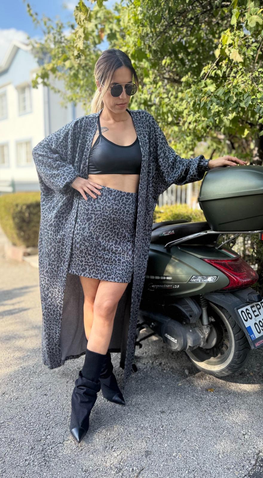 leopar desenli hırka etek takım